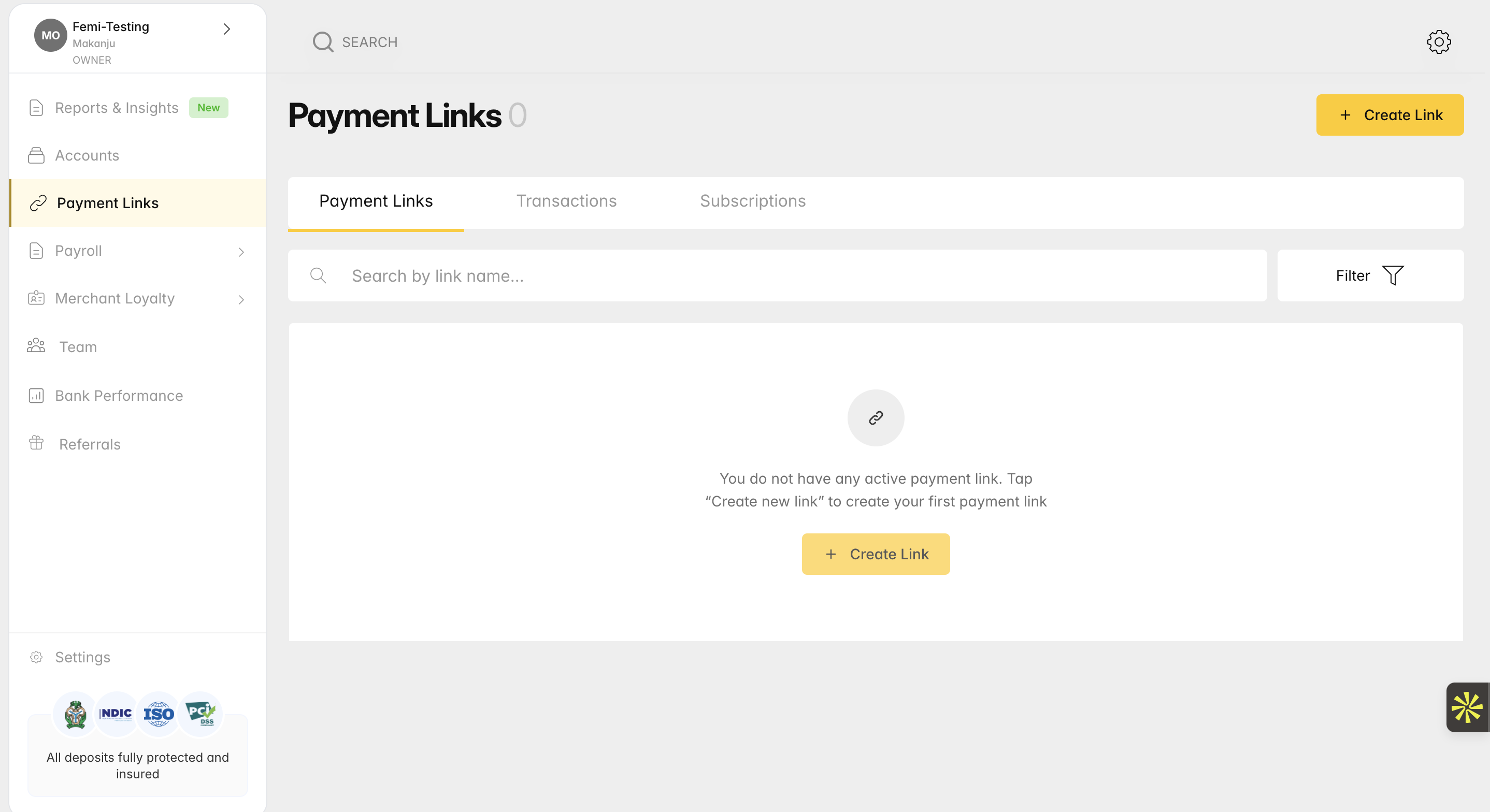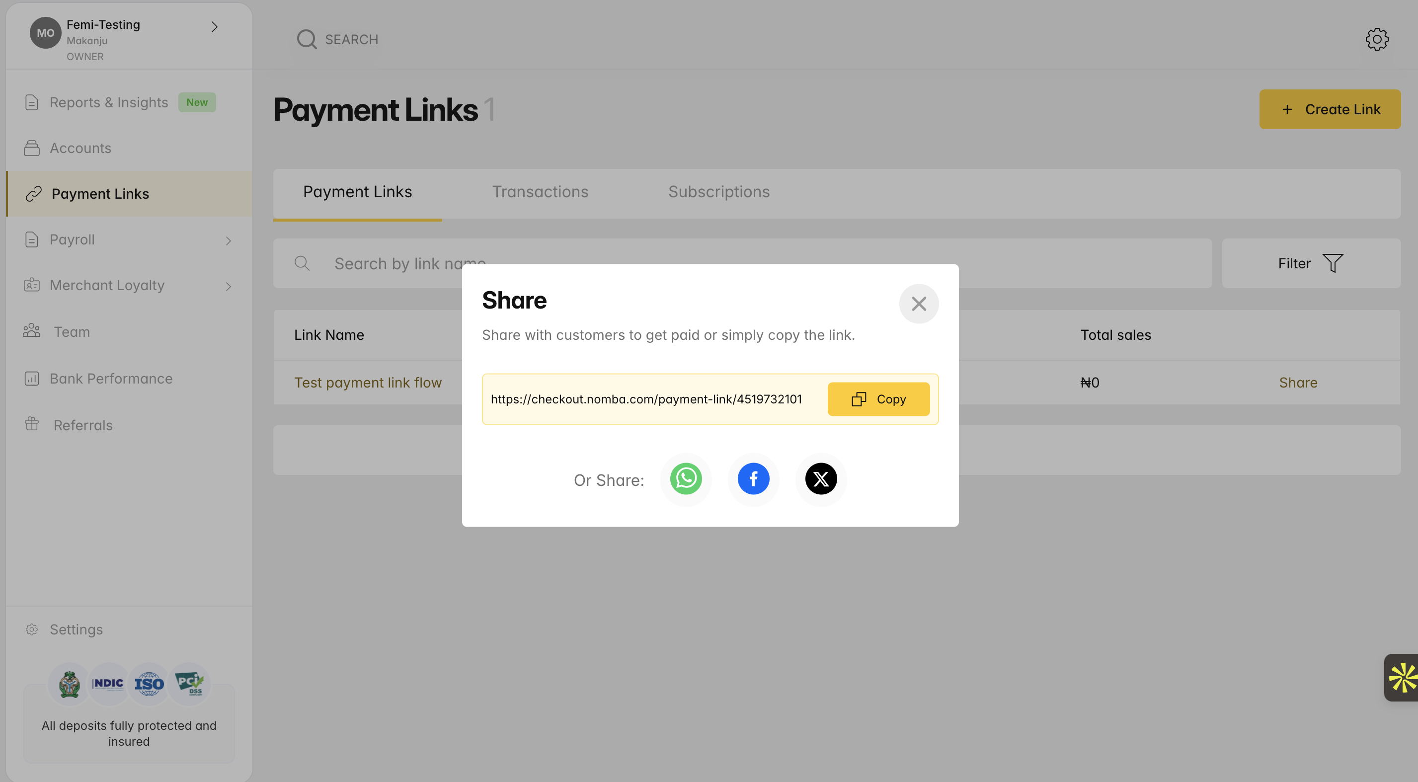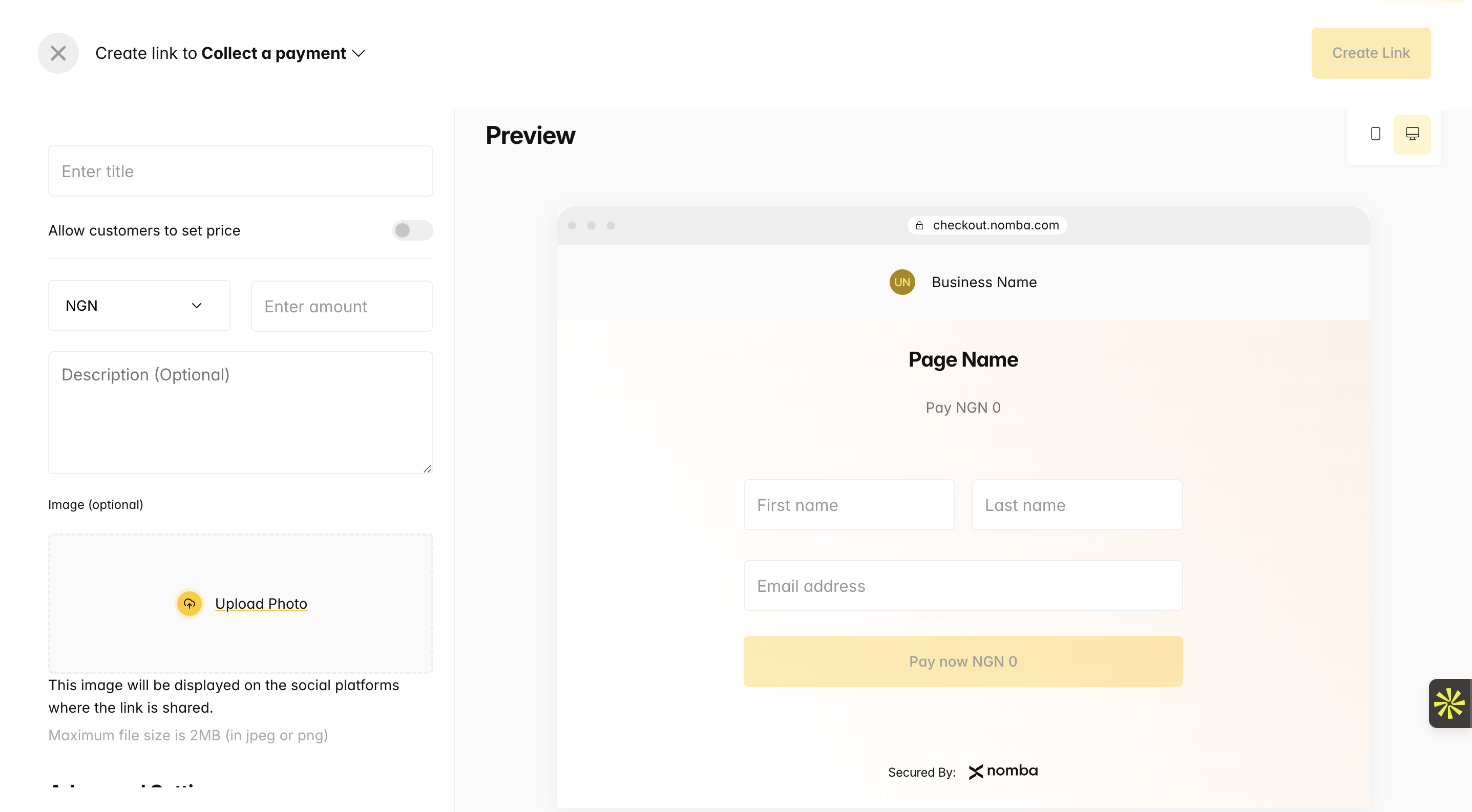 Nomba provides numerous ways to accept payment between merchants and their customers. Payment solutions like POS terminals (point of sale), mobile banking for local and international payments, and Vendor API for businesses looking to integrate payment flow for their businesses. All of these are excellent ways to accept payment. However, Nomba has also provided a payment link for accepting payment via a shareable unique URL that can be sent via email, social channel and any other means for convenience and ease of accepting payment. Payment links are a convenient way to accept online payment without hassle; the unique link shared with a customer will redirect to a payment page where they will complete the payment.Create a Payment link