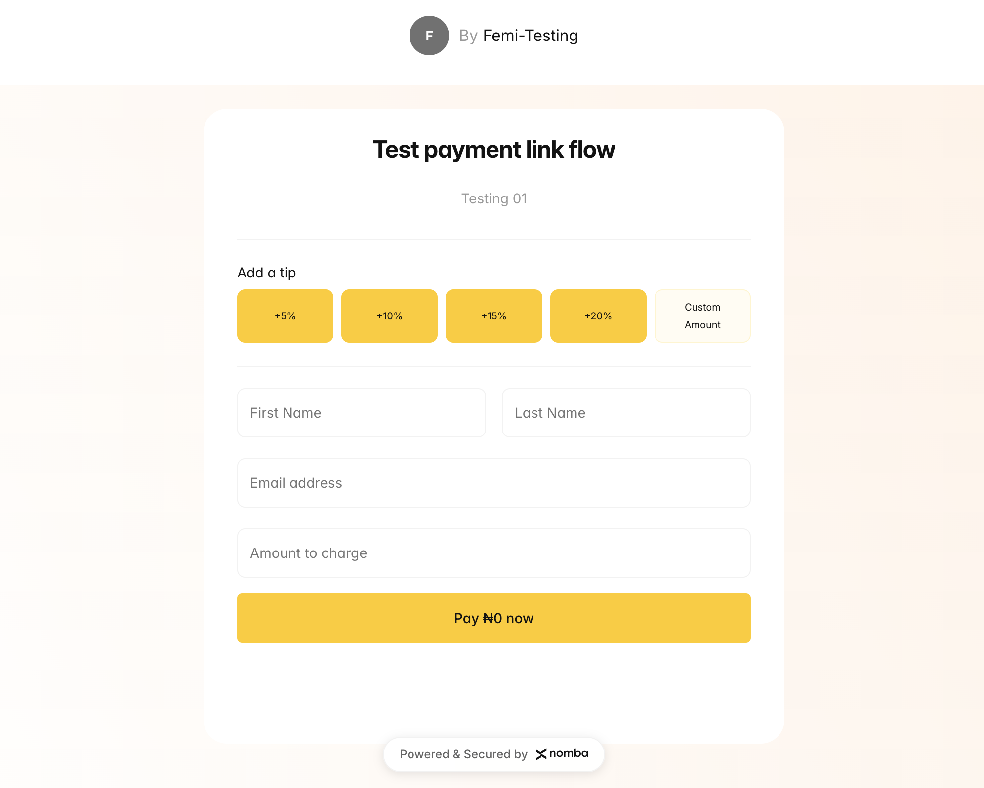 When a customer opens this link, it redirects them to this view where they enter their name and email before completing the payment on the Nomba checkout page.